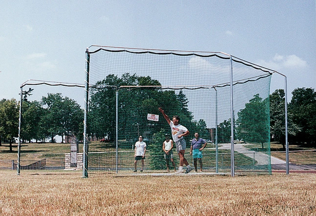 This Pro-Down Discus Cage With Ground Plates features six 11 feet high (3.3m) galvanized steel upright posts that are angled at the top for added protection. The surrounding net is constructed from 200 pound. test, 1-3/4 inches (4.4cm) weather-treated nylon mesh. The top of the net has grommets every 24 inches (60cm) with special, easy clip-on hanging hooks. A replacement net with the same construction specifications is available separately. Meets all NFHS specifications. Search Pro-Down Discus Cages for more options.