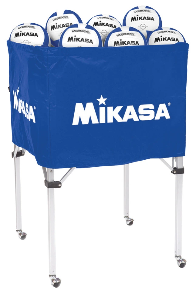 Mikasa Royal Blue Classic Collapsible Ball Cart measuring 25 x 25 x 40 in holds 24 balls. Cart features a steel frame and heavy duty wheels, and comes with a matching carrying bag with adjustable shoulder strap that doubles as a 6 ball tube.