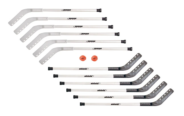 Shield Elementary Outdoor Floor Hockey Complete Set is ideal for 4th graders and features 36 inches safety hot sticks with flexible plastic and a one piece construction. Outdoor blades wear well on concrete and asphalt, but will scratch gym floors. Set includes 12 sticks, 2 speed control balls and an instruction booklet.